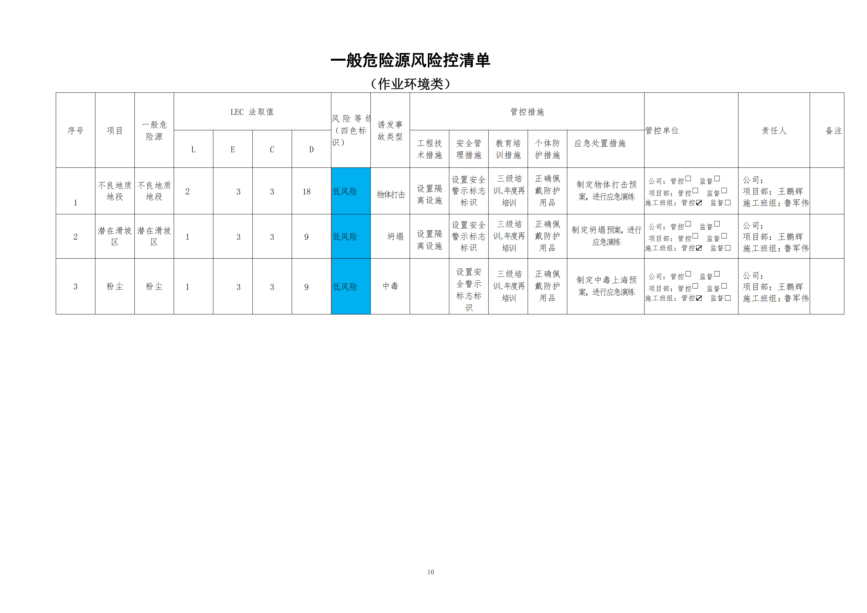 欒川縣新建水庫一期工程施工一標段危險源風險分級管控清單(3月)